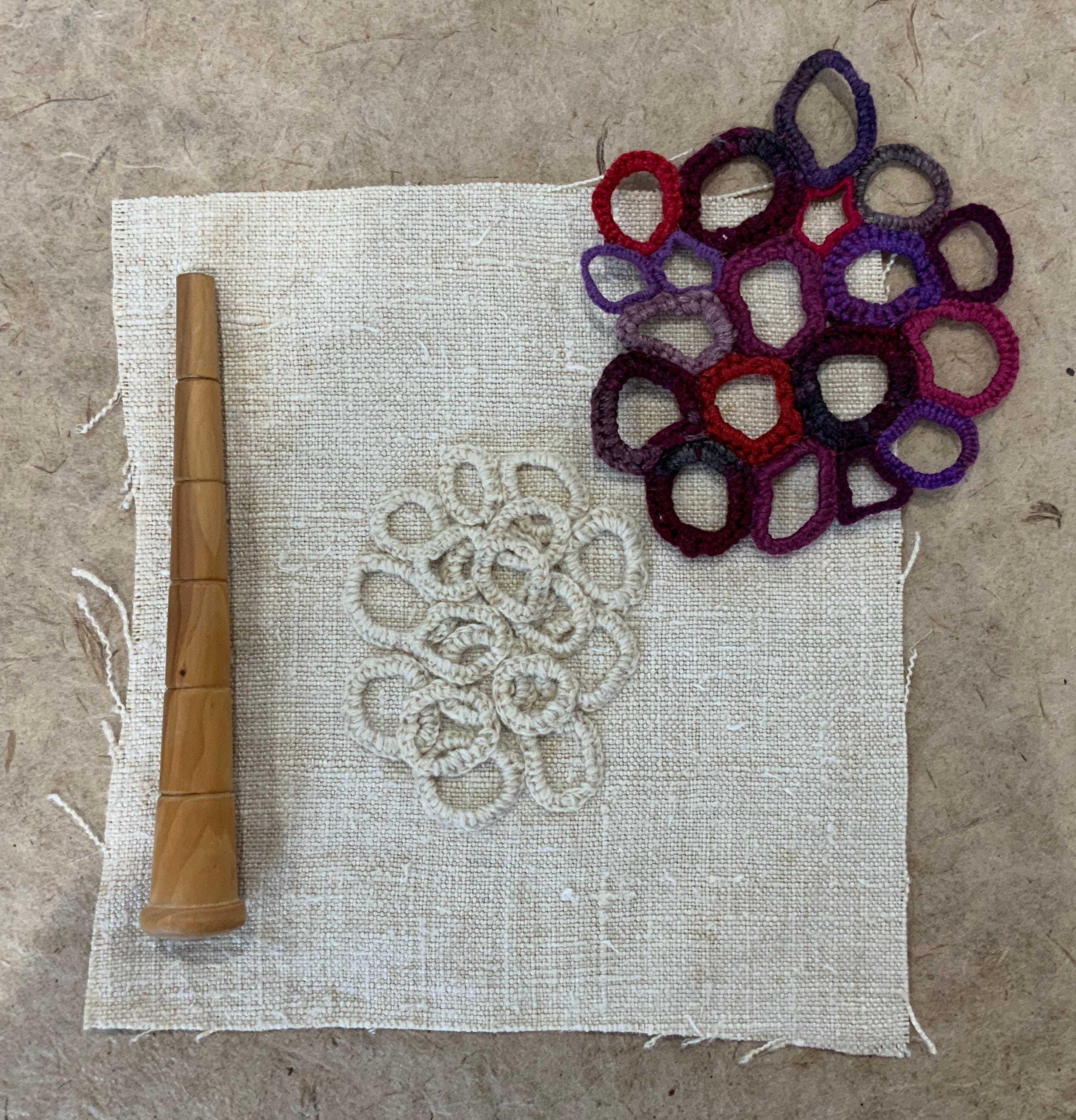 The more recent pieces are much easier to work out. The same thread is used for the core as the wrapping, the wrapping is done using the couronne stick shown in the picture to form and shape the loops.
