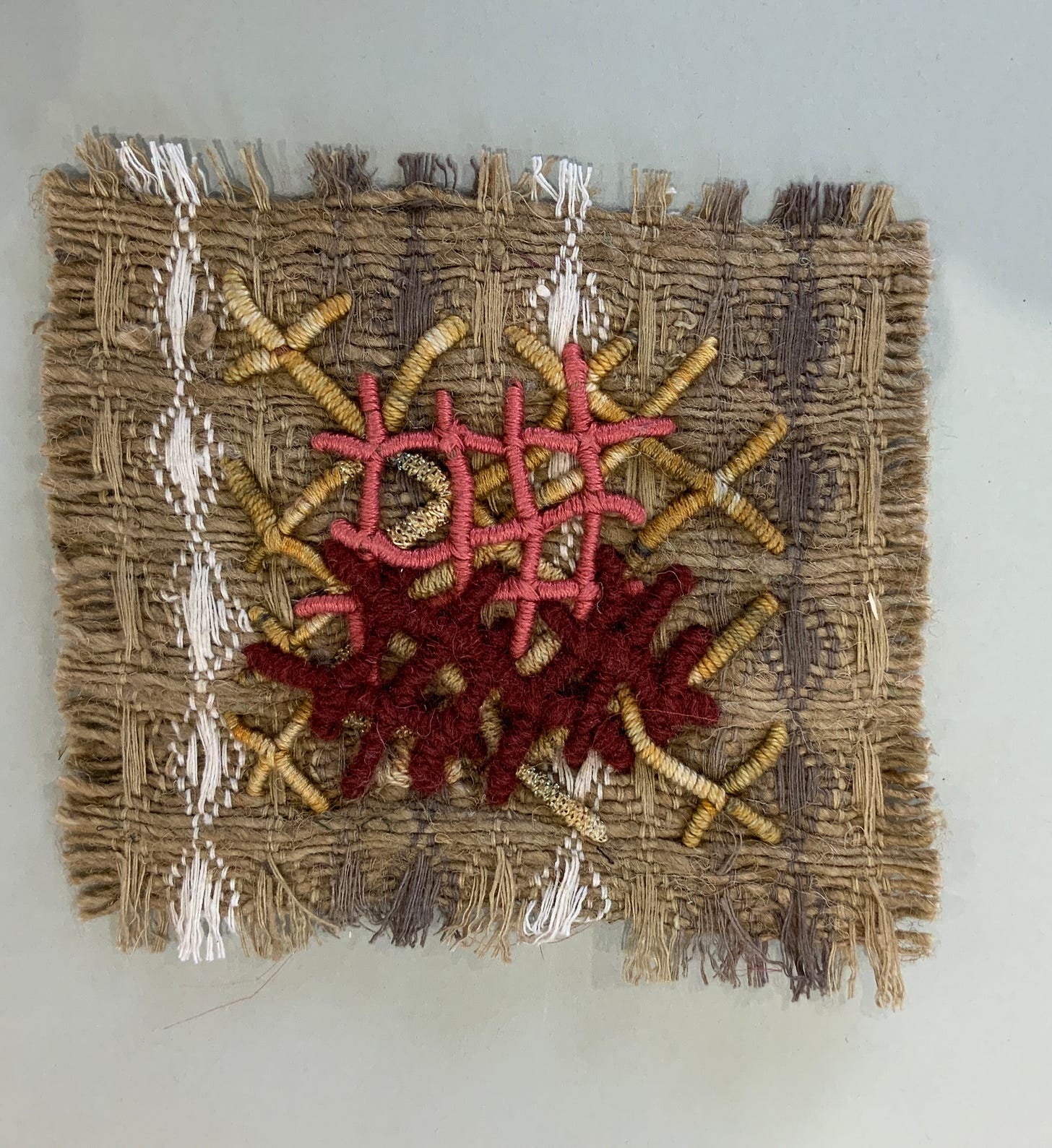 Trying to work out how I made the first sample almost 25 years ago has taxed my brain a bit. I’m still not entirely sure what is at the heart of the wrapped crosses, or whether the wrapping is stitched, or possibly worked as half-hitches.